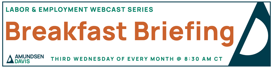 Join Amundsen Davis for a complimentary webcast series, Breakfast Briefing. This series offers employers the tips, tricks, and guidance needed to thrive in an ever-changing landscape. Our attorneys will cover the hottest topics in labor and employment law, such as FMLA, immigration, benefits, and more. The series takes place every third Wednesday of the month starting at 8:30 AM CT.